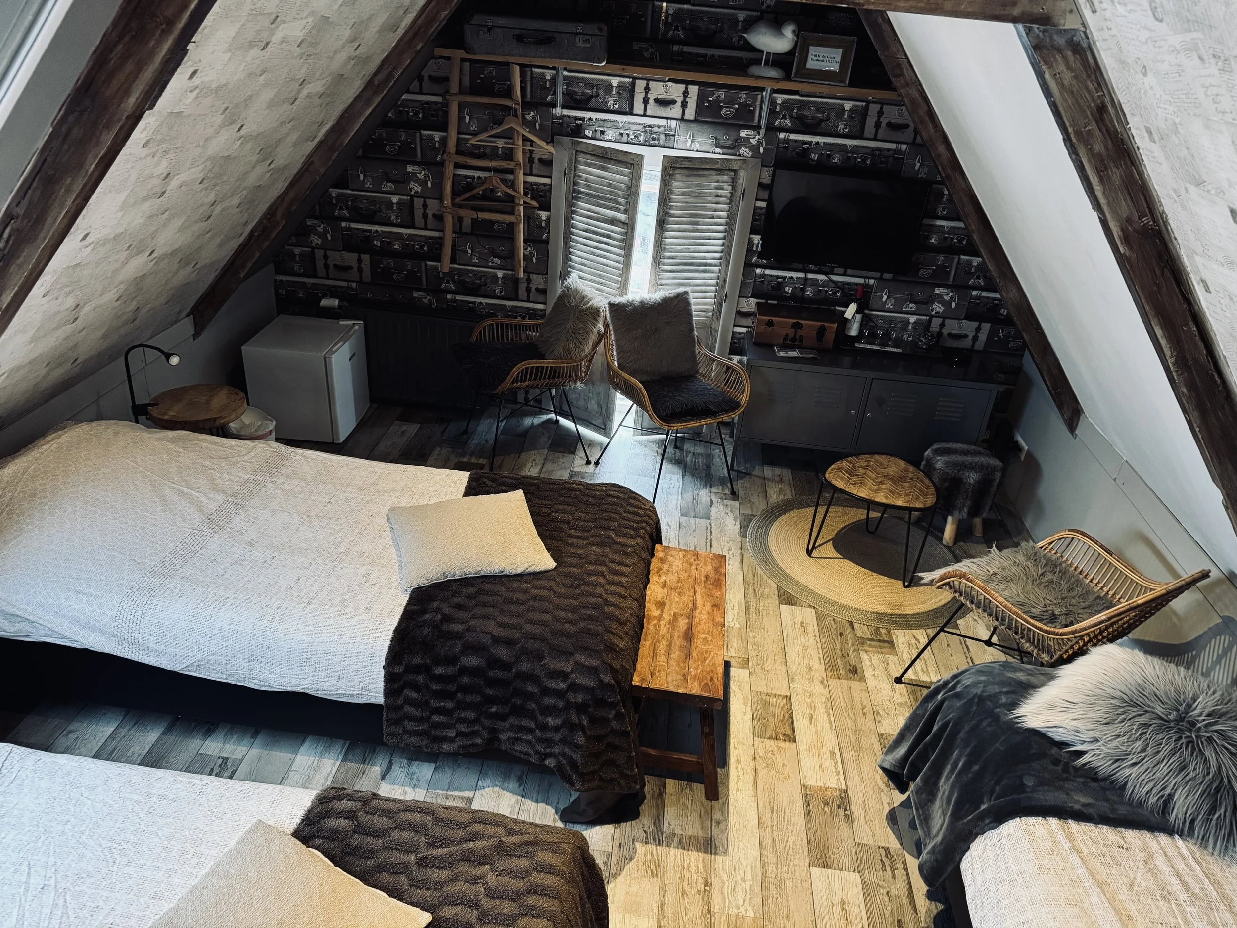 De Herberg is met oog voor detail ingericht en ademt het thema ‘Op reis’. De schuine kap met zichtbare houten balken geeft de kamer karakter en een warme uitstraling. Op de bovenste plank zorgen koffers en decoratieve objecten voor een speels, reislustig accent. Het houten laddertje, de raamluiken en natuurlijke materialen versterken het ambachtelijke gevoel. Alles is zorgvuldig op elkaar afgestemd, waardoor de kamer persoonlijk, rustig en uitnodigend aanvoelt zonder drukte.