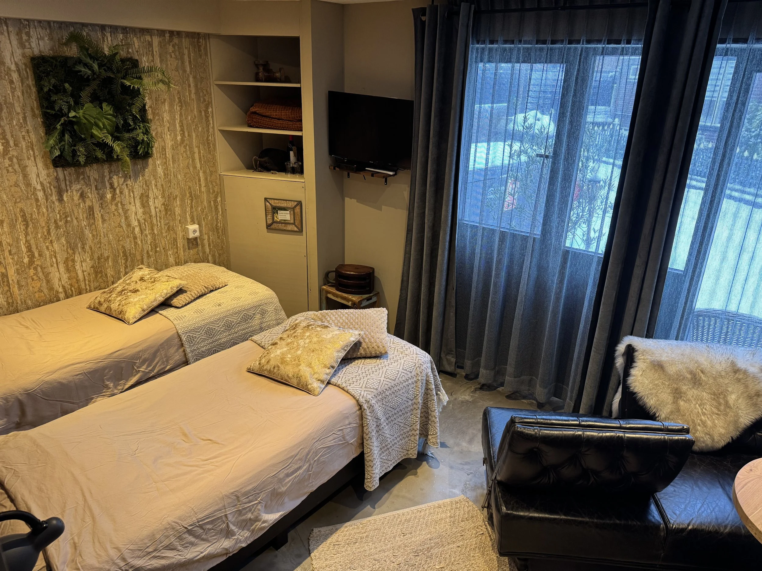 Het slaapgedeelte bestaat uit twee comfortabele eenpersoonsbedden, geschikt voor een goede nachtrust. De bedden zijn naast elkaar opgesteld en bieden voldoende ruimte om te ontspannen. De rustige grijstint inrichting draagt bij aan een prettige sfeer in de kamer. we hebben naast de bedden ook een klein plankje gemaakt voor bijvoorbeeld in de nacht je telefoon op te leggen Na een dag in de omgeving is dit een fijne plek om tot rust te komen. De kamer is praktisch en comfortabel ingericht.